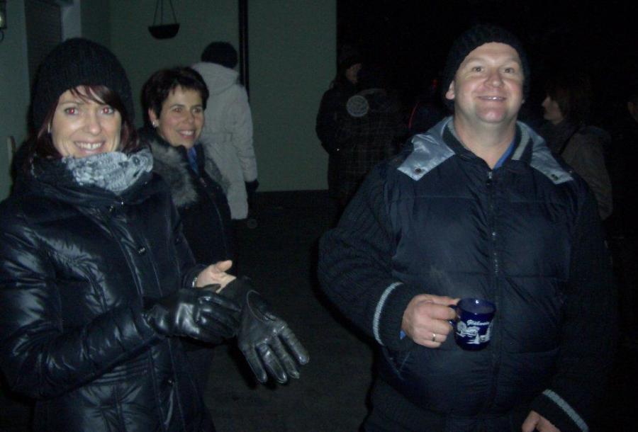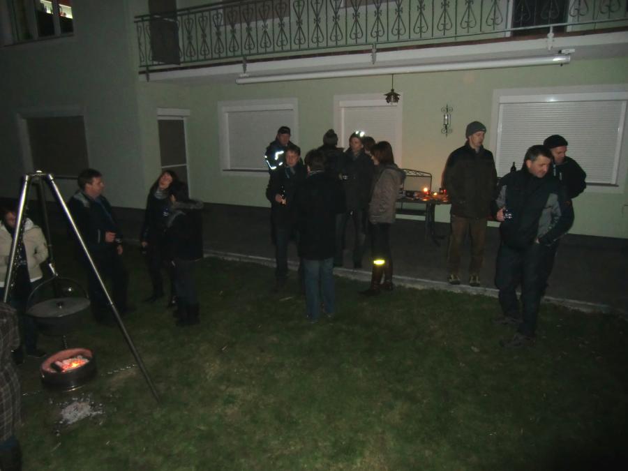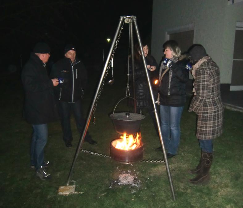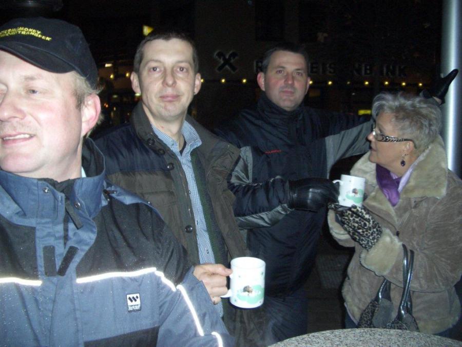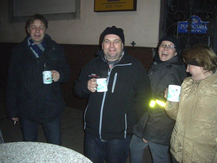 Wir trafen uns um 18 Uhr bei Tanja&Berni. Dort gab's im Garten heißen Punsch (vom Poldy zubereitet nach dem Originalrezept vom FC-Blaunase), kaltes Bier und köstliche, selbstgemachte Kekse von Tanja und Andrea.